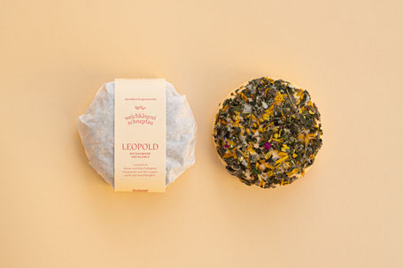 Leopold, unser Kräutercharmeur ist ein junger Weichkäse mit mildem Rotschmieraroma und leicht topfigem Kern, welcher mit zunehmendem Alter eine glatte, fein glänzende Konsistenz erlangt.